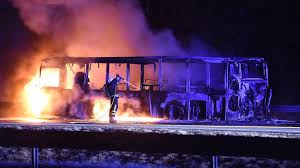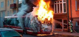 Nu vällde det ut våldsamt med rök från bussen och man förstod ju att detta inte var bra alls! Det dröjde inte heller många sekunder innan det även slog ut rena eldslågor från bussens motor, och inom någon minut brann ju hela bussen som en fackla. Bussens säten blev ju rena brandbomberna!