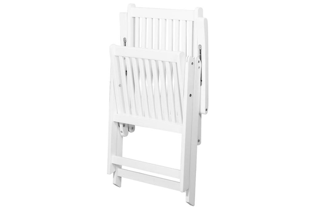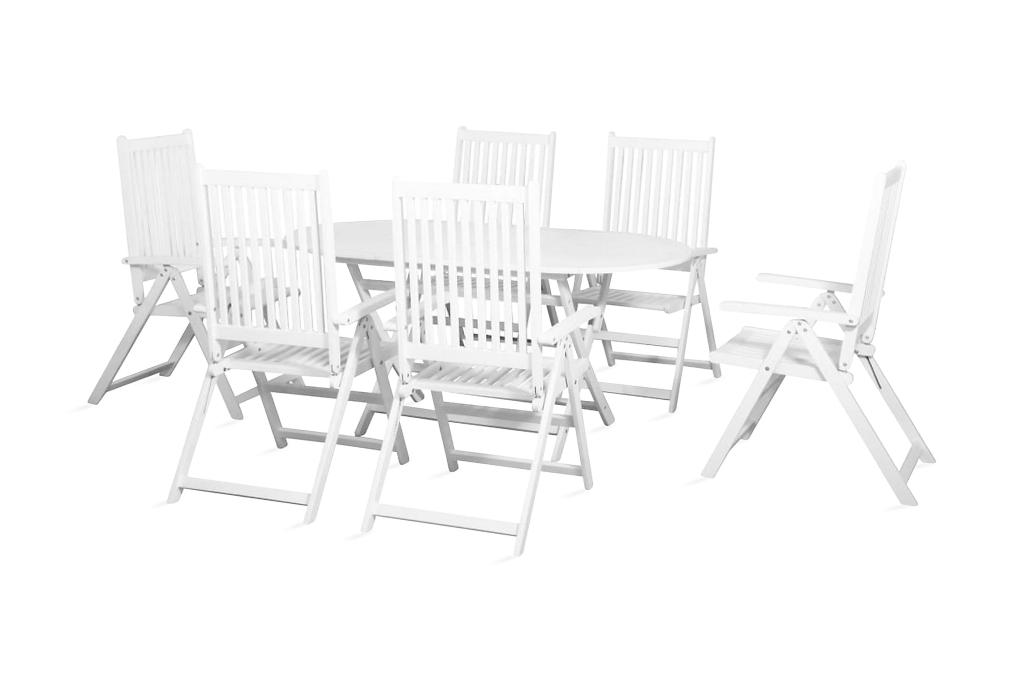 ”Denna eleganta och moderna hopfällbara matgrupp i trä för trädgården tillför ett stänk av lyx till dekoren. Vår uppsättning trädgårdsmöbler blir knutpunkten i din trädgård, på din terrass eller uteplats. Matgruppen är tillverkad i högkvalitativt akaciaträ, vilket är känt som ett tropiskt lövträ. Den är väderbeständig och mycket lämplig för utomhusbruk. Den målade ytan är dessutom enkel att rengöra. Stolarna kan justeras i 5 lägen, vilket ger optimal sittkomfort. Bordet och stolarna kan fällas ihop för att spara plats när de inte används. Matgruppen är lätt att montera. Leveransen inkluderar 1 bord och 6 hopfällbara stolar. Färg: Vit”