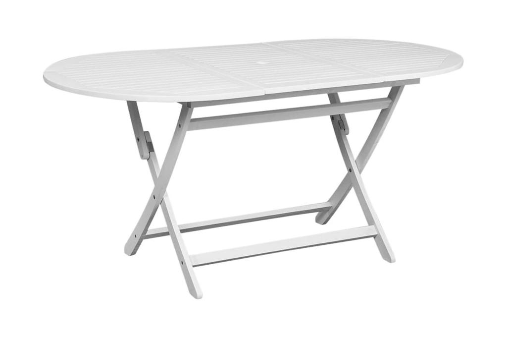 Vi hade beställt ett hopfällbart träbord och sex hopfällbara trästolar. Stolarna var enligt klassiskt snitt. Bordet var avlångt med rundande ändar. En klassisk vitmålad matgrupp i massivt trä för uteplatsen, helt enkelt!