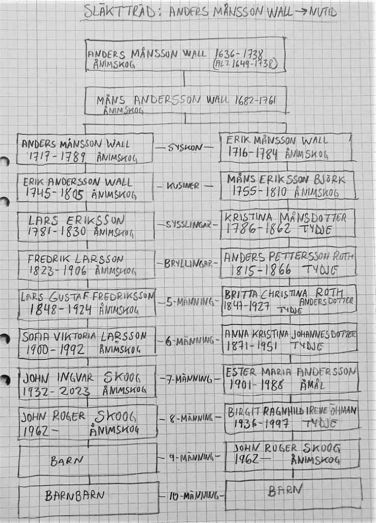 Anders Månsson Wall är som sagt en väldigt avlägsen släkting. Han befinner sig på 9 och 10 generationers avstånd. Orsaken till detta beror på att jag är släkt med denna historiska Ånimskog-profil, via två olika släktgrenar – både via min far, som min mor. Lite speciellt (och kanske lite unikt) kanske, men ändå inte direkt ovanligt i ett historiskt perspektiv. Det finns även en Facebook-grupp på lite drygt hundra personer som är släkt med denna Anders Månsson Wall. Jo, jag är också medlem.
