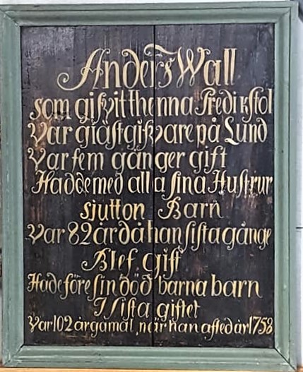 ”I Ånimskogs kyrka i Dalsland finns en minnestavla med inskriptionen: ”Anders Wall, som gifvit denna predikstol, var gästgifvare på Lund. Var fem gånger gift. Hade med alla sina hustrur 17 barn. Var 82 år då han sista gången blef gift. Hade före sin död barnbarn i sista giftet. Var 102 år när han afled 1758.”
