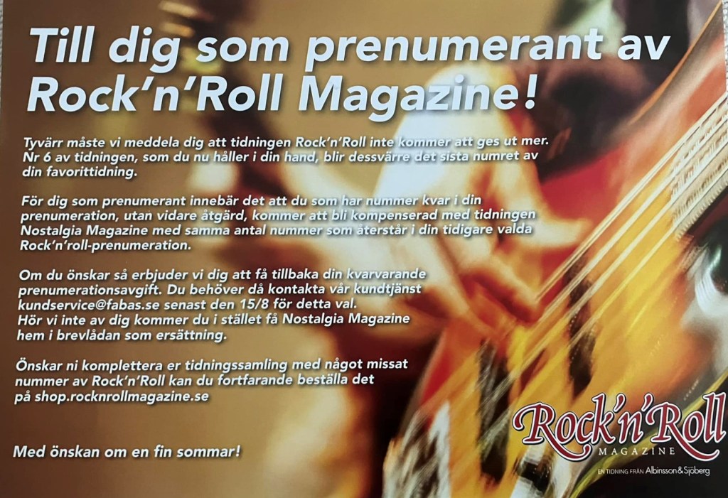 Förutom ”Rock ’n’ Roll Magazine”, prenumererar jag på Sweden Rock Magazine, och har alltid tyckt att dessa två tidskrifter kompletterat varandra på ett fint sätt. Problemet för ”Rock ’n’ Roll Magazine” är att den kanske har varit något för bred gällande genrer, tidsspann och typ av musik. Mig har det passat perfekt, men tydligen inte målgruppen i stort. Men den stora målgruppen är egentligen inte är speciellt intresserad av att läsa om musik överhuvudtaget och definitivt inte betala för det.